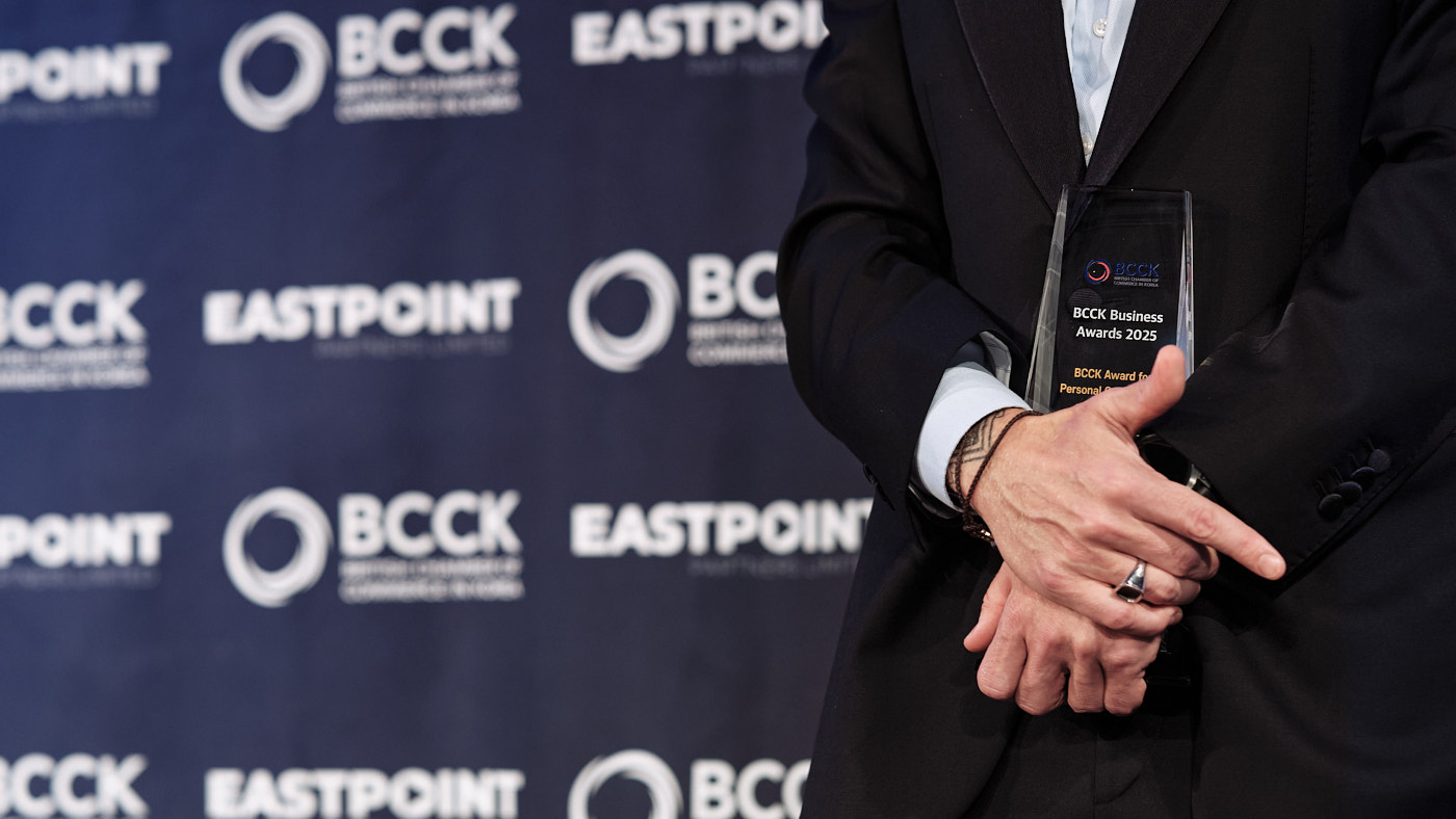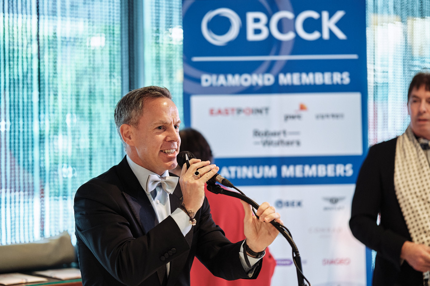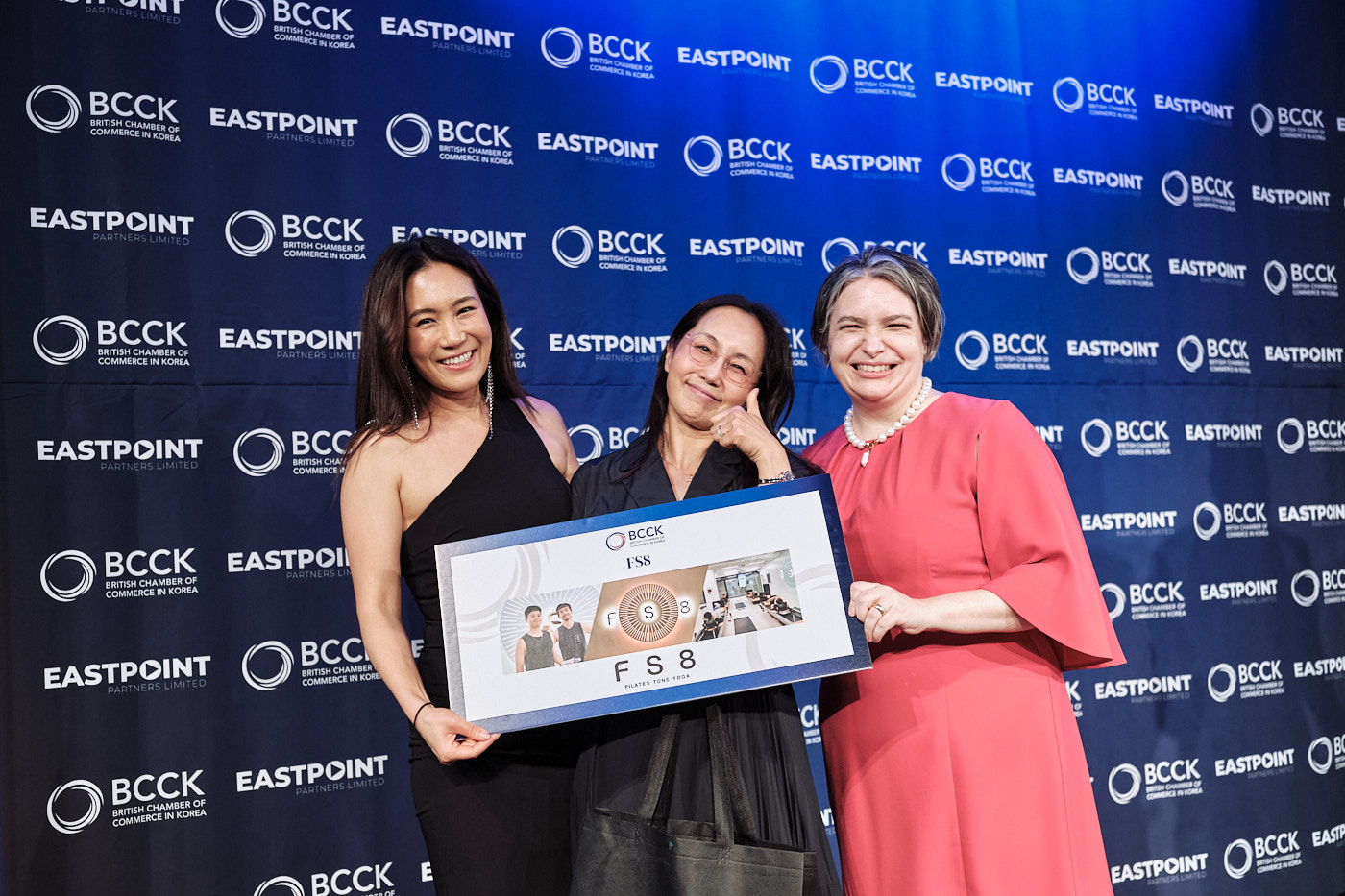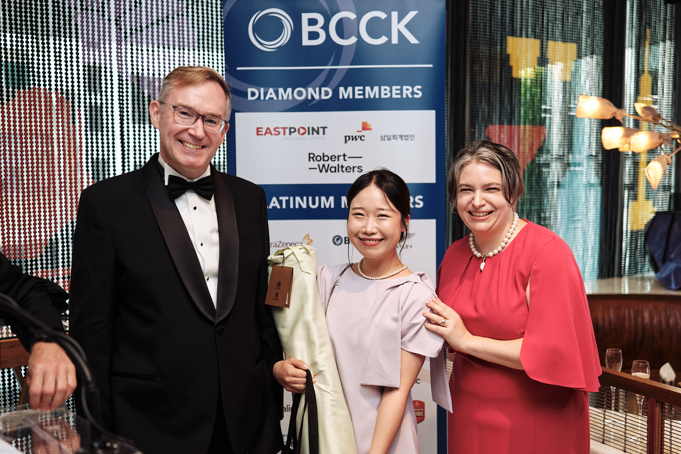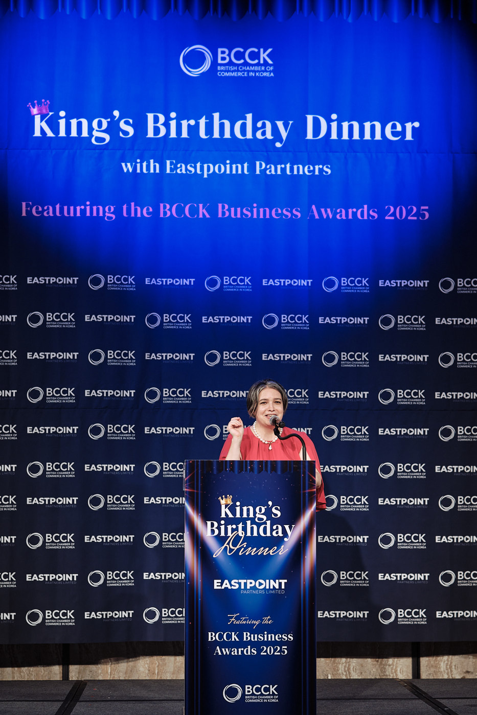 The second section of the event was the BCCK’s Business Awards Presentations. The schedule was incredibly tight and we didn’t have even a moment to pause, pose, and get a clear shot of each awardee on stage. That would need to happen after the fact. So, as each awardee was walking off stage, the next was already on their way up. As soon as the stage section was done and the first course was being served, we quickly pulled everyone over to the photo wall and got our official award shots.